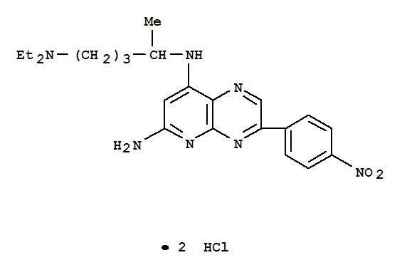 - Synonyms:Pyrido[2,3-b]pyrazine,6-amino-8-[[4-(diethylamino)-1-methylbutyl]amino]-3-(p-nitrophenyl)-,dihydrochloride (8CI); NSC 132263