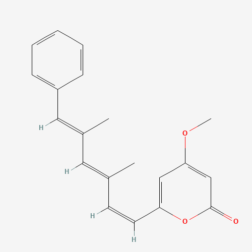 - Synonyms:Nigerapyrone H;CHEBI:69265;CHEMBL1823138;DTXSID501129274;Q27137604;2H-Pyran-2-one, 6-[(1Z,3E,5E)-3,5-dimethyl-6-phenyl-1,3,5-hexatrien-1-yl]-4-methoxy-;6-[(1Z,3E,5E)-3,5-dimethyl-6-phenylhexa-1,3,5-trienyl]-4-methoxy-2H-pyran-2-one;1318240-79-7