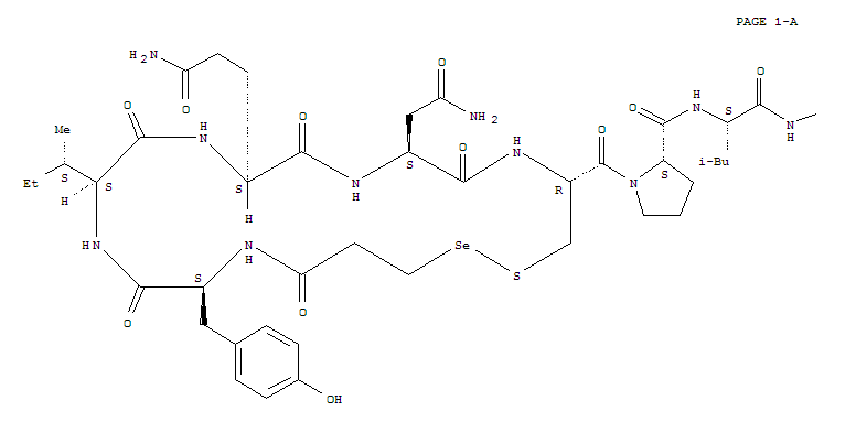 - Synonyms:Oxytocin,1-(3-selenylpropionic acid)- (8CI); 1-Thia-2-selena-6,9,12,15,18-pentaazacycloeicosane,cyclic peptide deriv.; 1-(3-Selenylpropionic acid)oxytocin;Deamino-1-selenooxytocin; Deaminooxytocin 1-seleno analog; Oxytocin, deamino-,1-seleno analog