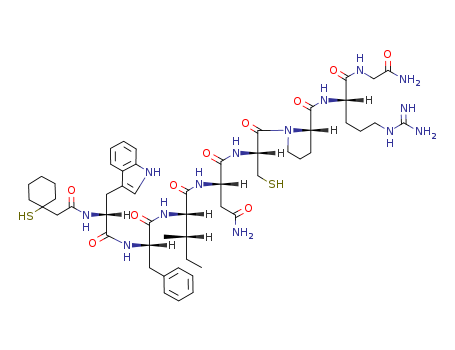 - Synonyms:Vasopressin,1-(1-mercaptocyclohexaneaceticacid)-2-D-tryptophan-4-L-isoleucine-8-L-arginine-;7,8-Dithia-11,14,17,20,23-pentaazaspiro[5.19]pentacosane, cyclic peptide deriv.