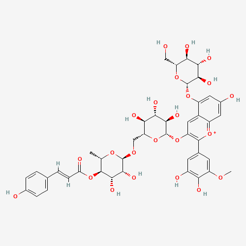 - Synonyms:Petunidin-3-(p-coumaroyl)-rutinoside-5-glucoside;106863-71-2;CHEBI:80431;DTXSID401347732;Petunidin-3-O-(6''-O-(4'''-O-E-coum)-alpha-rhamnopyranosyl-beta-glucopyranosyl)-5-O-beta-glucopyranoside;Petunidin 3-coumaroylrutinoside 5-glucoside;Q27149483;[(2S,3R,4S,5R,6R)-6-[[(2R,3S,4S,5R,6S)-6-[2-(3,4-dihydroxy-5-methoxyphenyl)-7-hydroxy-5-[(2S,3R,4S,5S,6R)-3,4,5-trihydroxy-6-(hydroxymethyl)oxan-2-yl]oxychromenylium-3-yl]oxy-3,4,5-trihydroxyoxan-2-yl]methoxy]-4,5-dihydroxy-2-methyloxan-3-yl] (E)-3-(4-hydroxyphenyl)prop-2-enoate