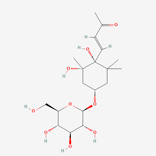 - Synonyms:Pisumionoside;CHEBI:168297;DTXSID401114375;(3E)-4-[(1R,2S,4S)-4-(beta-D-Glucopyranosyloxy)-1,2-dihydroxy-2,6,6-trimethylcyclohexyl]-3-buten-2-one;(E)-4-[(1R,2S,4S)-1,2-dihydroxy-2,6,6-trimethyl-4-[(2R,3R,4S,5S,6R)-3,4,5-trihydroxy-6-(hydroxymethyl)oxan-2-yl]oxycyclohexyl]but-3-en-2-one;371113-06-3