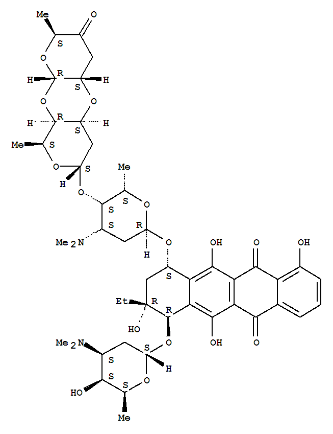 - Synonyms:5,12-Naphthacenedione,10-[[[2''',3''-anhydro]-O-3,6-dideoxy-a-L-erythro-hexopyranos-4-ulosyl-(1®4)-O-2,6-dideoxy-a-L-lyxo-hexopyranosyl-(1®4)-2,3,6-trideoxy-3-(dimethylamino)-a-L-lyxo-hexopyranosyl]oxy]-8-ethyl-7,8,9,10-tetrahydro-1,6,8,11-tetrahydroxy-7-[[2,3,6-trideoxy-3-(dimethylamino)-a-L-lyxo-hexopyranosyl]oxy]-,[7R-(7a,8b,10b)]-; 2H,7H-Dipyrano[2,3-b:4',3'-e][1,4]dioxin, 5,12-naphthacenedionederiv.; Cytorhodin S; Rodorubicin
