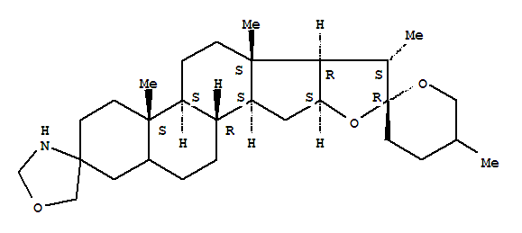 - Synonyms:Dispiro[oxazolidine-4,2'-[2H]naphth[2',1':4,5]indeno[2,1-b]furan-8'(1'H),2''-[2H]pyran],spiro[oxazolidine-4,3'-spirostan] deriv.;Dispiro[oxazolidine-4,2'-[2H]naphth[2',1':4,5]indeno[2,1-b]furan-8'(1'H),2''-[2H]pyran],eicosahydro-4'a,5'',6'a,7'-tetramethyl-, [4'aS-(4'aa,4'bb,6'aa,6'bb,7'b,8'b,9'ab,10'ab,10'ba)]-; [4'aS-(4'aa,4'bb,6'aa,6'bb,7'b,8'b,9'ab,10'ab,10'ba)]-Eicosahydro-4'a,5'',6'a,7'-tetramethyldispiro[oxazolidine-4,2'-[2H]naphth[2',1':4,5]indeno[2,1-b]furan-8'(1'H),2''-[2H]pyran]