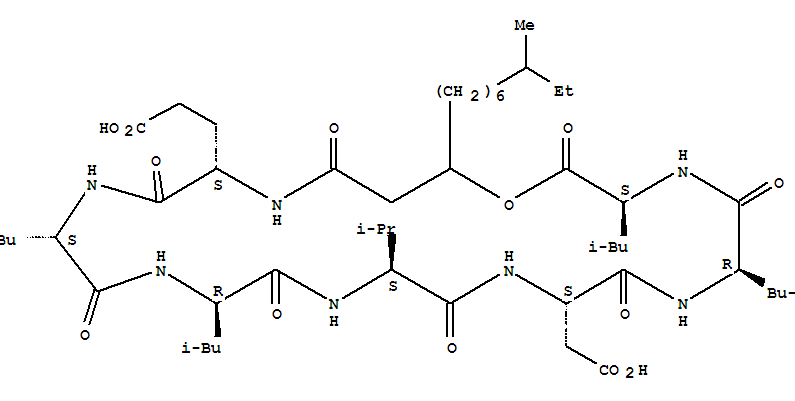 - Synonyms:Cyclo(L-a-aspartyl-D-leucyl-L-leucyl-3-hydroxy-10-methyldodecanoyl-L-a-glutamyl-L-leucyl-D-leucyl-L-valyl)