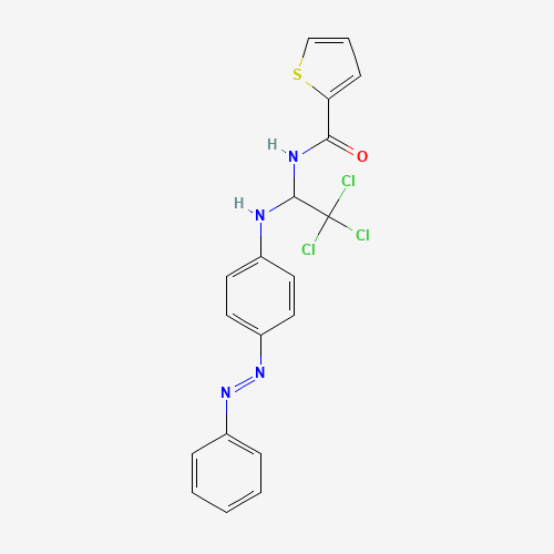 - Synonyms:DTXSID901037803;AKOS000530073;THIOPHENE-2-CARBOXYLIC ACID (2,2,2-TRICHLORO-1-(4-PHENYLAZO-PHENYLAMINO)ET)AMIDE;1321674-06-9;2-Thiophenecarboxamide, N-[2,2,2-trichloro-1-[[4-[(1E)-2-phenyldiazenyl]phenyl]amino]ethyl]-