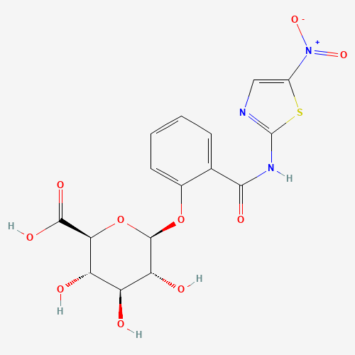 - Synonyms:Tizoxanide glucuronide;XA8XRC57UL;296777-75-8;(2S,3S,4S,5R,6S)-3,4,5-Trihydroxy-6-(2-((5-nitrothiazol-2-yl)carbamoyl)phenoxy)tetrahydro-2H-pyran-2-carboxylic acid;UNII-XA8XRC57UL;CHEMBL4066234;CHEBI:189884;.BETA.-D-GLUCOPYRANOSIDURONIC ACID, 2-(((5-NITRO-2-THIAZOLYL)AMINO)CARBONYL)PHENYL;2-(((5-NITRO-2-THIAZOLYL)AMINO)CARBONYL)PHENYL .BETA.-D-GLUCOPYRANOSIDURONIC ACID;2-(((5-Nitro-2-thiazolyl)amino)carbonyl)phenyl beta-D-glucopyranosiduronic acid;beta-D-Glucopyranosiduronic acid, 2-(((5-nitro-2-thiazolyl)amino)carbonyl)phenyl;(2S,3S,4S,5R,6S)-3,4,5-trihydroxy-6-[2-[(5-nitro-1,3-thiazol-2-yl)carbamoyl]phenoxy]oxane-2-carboxylic acid