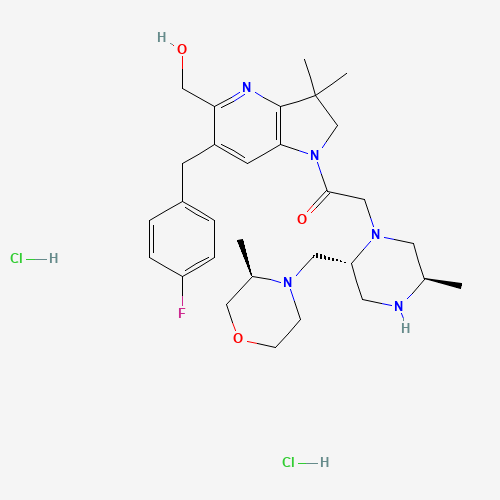 - Synonyms:Tolinapant dihydrochloride;8A5HG6UTT6;1799328-50-9;1-(6-(4-Fluorobenzyl)-5-(hydroxymethyl)-3,3-dimethyl-2,3-dihydro-1H-pyrrolo[3,2-b]pyridin-1-yl)-2-((2R,5R)-5-methyl-2-(((R)-3-methylmorpholino)methyl)piperazin-1-yl)ethan-1-one dihydrochloride;Ethanone, 1-(6-((4-fluorophenyl)methyl)-2,3-dihydro-5-(hydroxymethyl)-3,3-dimethyl-1H-pyrrolo(3,2-b)pyridin-1-yl)-2-((2R,5R)-5-methyl-2-(((3R)-3-methyl-4-morpholinyl)methyl)-1-piperazinyl)-, hydrochloride (1:2);UNII-8A5HG6UTT6;CHEMBL4165643;SCHEMBL16830776