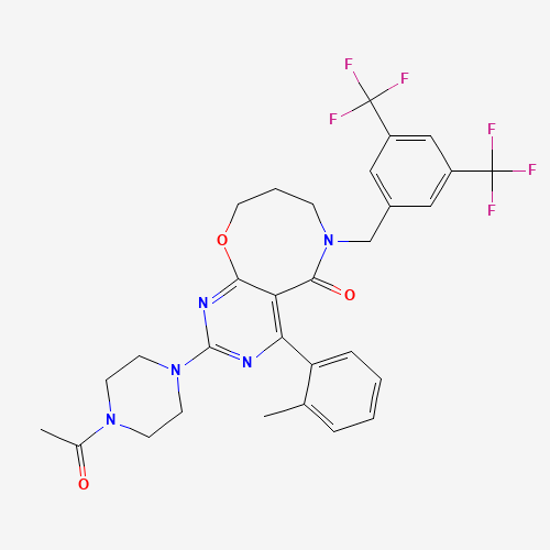 - Synonyms:2-(4-acetylpiperadin-1-yl)-6-(3,5-bis(trifluoromethyl)phenylmethyl)-4-(2-methylphenyl)-6,7,8,9-tetrahydro-5H-pyrimido(4,5-b)(1,5)oxazocin-5-one;KRP-103