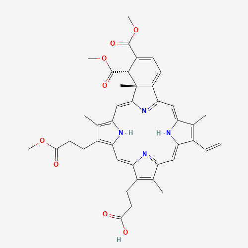 - Synonyms:18-ethenyl-4,4a-dihydro-3,4-bis(methoxycarbonyl)-4a,8,14,19-tetramethyl-23H,25H-benzo(b)porphine-9,13-dipropanoic acid monomethyl ester;benzoporphyrin derivative monoacid ring A;BPD verteporfin;BPD-MA;verteporfin;verteporphin;Visudyne