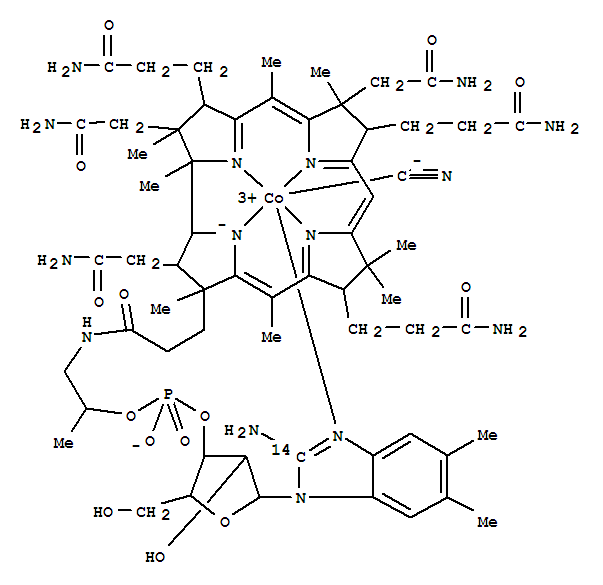 - Synonyms:Cobinamide,cyanide, dihydrogen phosphate (ester), inner salt, 3'-ester with 1-a-D-ribofuranosyl-1H-benzimidazol-2-amine-2-14C