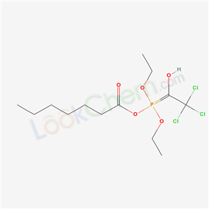 - Synonyms:[diethoxy-(2,2,2-trichloro-1-hydroxyethylidene);Phosphonic acid,(2,2,2-trichloro-1-hydroxyethyl)-,diethyl ester,heptanoate;O,O-Diethyl 2,2,2-trichloro-1-heptanoyloxyethyl phosphonate;HEPTANOIC ACID,ESTER with DIETHYL (2,2,2-TRICHLORO-1-HYDROXYETHYL)PHOSPHONATE;