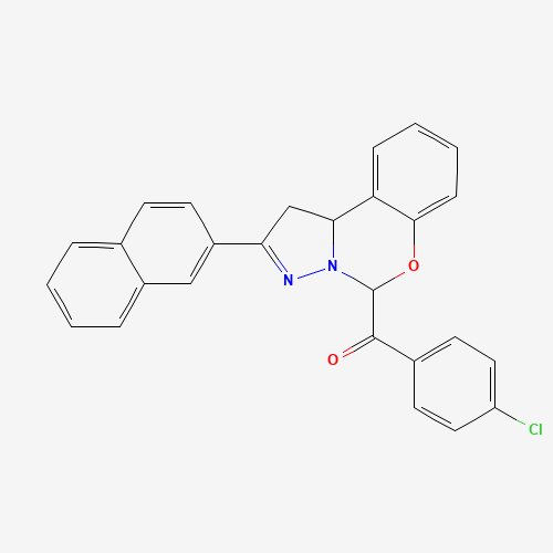 - Synonyms:Oprea1_606422;AKOS024423967;(4-CHLOROPHENYL)[2-(2-NAPHTHYL)-1,10B-DIHYDROPYRAZOLO[1,5-C][1,3]BENZOXAZIN-5-YL]METHANONE;303059-94-1;(4-Chlorophenyl)(2-(naphthalen-2-yl)-5,10b-dihydro-1H-benzo[e]pyrazolo[1,5-c][1,3]oxazin-5-yl)methanone;7-(4-chlorobenzoyl)-4-(naphthalen-2-yl)-8-oxa-5,6-diazatricyclo[7.4.0.0,trideca-1(13),4,9,11-tetraene