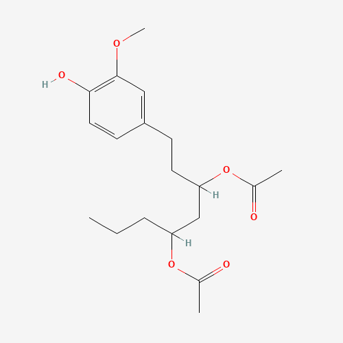 - Synonyms:[4]-Gingerdiol 3,5-diacetate;Diacetoxy-4-gingerdiol;863780-88-5;[6-acetyloxy-8-(4-hydroxy-3-methoxyphenyl)octan-4-yl] acetate;3,5-Octanediol, 1-(4-hydroxy-3-methoxyphenyl)-, 3,5-diacetate;[4]-Gingerdiacetate;AUBPDZJRJKZQEX-UHFFFAOYSA-N;CHEBI:172578;DTXSID701181941;AKOS040734216;1-(3-Methoxy-4-hydroxyphenyl)-3,5-diacetoxyoctane;1-(4-Hydroxy-3-methoxyphenyl)octane-3,5-diyl diacetate;5-(acetyloxy)-1-(4-hydroxy-3-methoxyphenyl)octan-3-yl acetate;53254-50-5