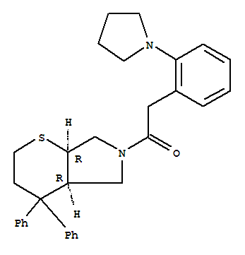 - Synonyms:Thiopyrano[2,3-c]pyrrole,octahydro-4,4-diphenyl-6-[[2-(1-pyrrolidinyl)phenyl]acetyl]-, cis- (9CI);Thiopyrano[2,3-c]pyrrole,octahydro-4,4-diphenyl-6-[[2-(1-pyrrolidinyl)phenyl]acetyl]-, cis-(?à)-