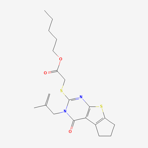 - Synonyms:DTXSID201104847;STK806176;AKOS000547430;332145-26-3;SR-01000454646;SR-01000454646-1;[5-(2-Methyl-allyl)-4-oxo-2,3,4,5-tetrahydro-1H-8-thia-5,7-diaza-cyclopenta[a]in;pentyl {[3-(2-methylprop-2-en-1-yl)-4-oxo-3,5,6,7-tetrahydro-4H-cyclopenta[4,5]thieno[2,3-d]pyrimidin-2-yl]sulfanyl}acetate;Pentyl 2-[[3,5,6,7-tetrahydro-3-(2-methyl-2-propen-1-yl)-4-oxo-4H-cyclopenta[4,5]thieno[2,3-d]pyrimidin-2-yl]thio]acetate