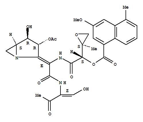 - Synonyms:1-Naphthalenecarboxylicacid, 3-methoxy-5-methyl-,2-[[1-[3-(acetyloxy)-4-hydroxy-1-azabicyclo[3.1.0]hex-2-ylidene]-2-[[1-(hydroxymethylene)-2-oxopropyl]amino]-2-oxoethyl]amino]-1-(2-methyloxiranyl)-2-oxoethylester, [3R-[2E[1[S*(S*)],2(E)],3a,4b,5a]]-; 1-Azabicyclo[3.1.0]hexane,1-naphthalenecarboxylic acid deriv.; Azinomycin B; Cardinophyllin;Carzinophilin; Carzinophilin A; Carzinophillin; Carzinophillin A; Carzinophyllin;NSC 20088