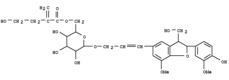 - Name: b-D-Glucopyranoside,3-[2,3-dihydro-2-(4-hydroxy-3-methoxyphenyl)-3-(hydroxymethyl)-7-methoxy-5-benzofuranyl]-2-propenyl,6-(4-hydroxy-2-methylenebutanoate), [2R-[2a,3b,5(E)]]- (9CI)
