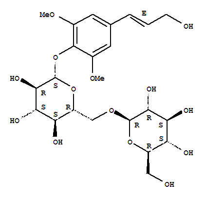 - Synonyms:b-D-Glucopyranoside,4-(3-hydroxy-1-propenyl)-2,6-dimethoxyphenyl 6-O-b-D-glucopyranosyl-, (E)-; b-D-Glucopyranoside,4-[(1E)-3-hydroxy-1-propenyl]-2,6-dimethoxyphenyl 6-O-b-D-glucopyranosyl- (9CI);Syringinoside