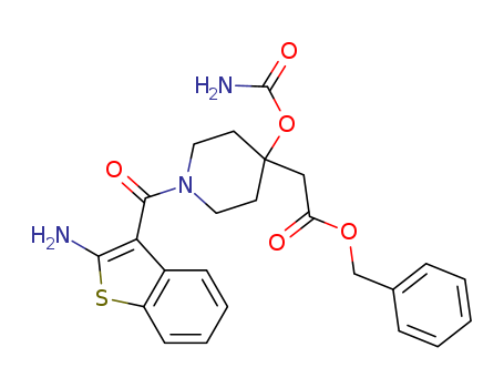 - Synonyms:benzyl {1-[(2-amino-1-benzothiophen-3-yl)carbonyl]-4-(carbamoyloxy)piperidin-4-yl}acetate