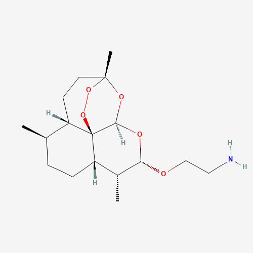 - Synonyms:beta-aminoarteether;Arteether amine;SM 934 free base;SM-934 free base;2TF7EGV39I;133162-24-0;2-(((3R,5aS,6R,8aS,9R,10S,12R,12aR)-Decahydro-3,6,9-trimethyl-3,12-epoxy-12H-pyrano(4,3-j)-1,2-benzodioxepin-10-yl)oxy)ethanamine;2-[[(1R,4S,5R,8S,9R,10S,12R,13R)-1,5,9-trimethyl-11,14,15,16-tetraoxatetracyclo[10.3.1.04,13.08,13]hexadecan-10-yl]oxy]ethanamine;??-Aminoarteether;2-[[(3R,5aS,6R,8aS,9R,10S,12R,12aR)-decahydro-3,6,9-trimethyl-3,12-epoxy-12H-pyrano[4,3-j]-1,2-benzodioxepin-10-yl]oxy]ethanamine;beta-2'-aminoarteether;UNII-2TF7EGV39I;.BETA.-AMINOARTEETHER;CHEMBL4803093;CHEBI:78567;AKOS040756645;10-(beta-aminoethoxy)dihydroartemisinin;2-(10beta-dihydroartemisinoxy)ethylamine;HY-137553;CS-0140201;Q27147853;2-[[[(3R,5aalpha,8aalpha,12aR)-Decahydro-3,6alpha,9beta-trimethyl-3beta,12alpha-epoxypyrano[4,3-j]-1,2-benzodioxepin]-10beta-yl]oxy]ethanamine;2-{[(1R,4S,5R,8S,9R,10S,12R,13R)-1,5,9-trimethyl-11,14,15,16-tetraoxatetracyclo[10.3.1.0(4,13).0(8,13)]hexadec-10-yl]oxy}ethanamine;ETHANAMINE, 2-((DECAHYDRO-3,6,9-TRIMETHYL-3,12-EPOXY-12H-PYRANO(4,3-J)-1,2-BENZODIOXEPIN-10-YL)OXY)-, (3R-(3.ALPHA.,5A.BETA.,6.BETA.,8A.BETA.,9.ALPHA.,10.ALPHA.,12.BETA.,12AR*))-;Ethanamine, 2-((decahydro-3,6,9-trimethyl-3,12-epoxy-12H-pyrano(4,3-j)-1,2-benzodioxepin-10-yl)oxy)-, (3R-(3alpha,5abeta,6beta,8abeta,9alpha,10alpha,12beta,12ar*))-