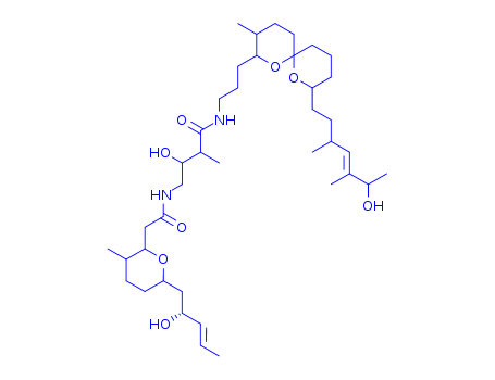- Synonyms:2H-Pyran-2-acetamide,tetrahydro-N-[(2R,3S)-2-hydroxy-4-[[3-[(2R,3S,6S,8S)-8-[(3S,4E,6S)-6-hydroxy-3,5-dimethyl-4-heptenyl]-3-methyl-1,7-dioxaspiro[5.5]undec-2-yl]propyl]amino]-3-methyl-4-oxobutyl]-6-[(2R,3E)-2-hydroxy-3-pentenyl]-3-methyl-,(2S,3S,6R)- (9CI); 1,7-Dioxaspiro[5.5]undecane, 2H-pyran-2-acetamide deriv.;Bistramide D