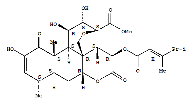 - Synonyms:Picras-2-en-21-oicacid,15-[(3,4-dimethyl-1-oxo-2-pentenyl)oxy]-13,20-epoxy-2,11,12-trihydroxy-1,16-dioxo-,methyl ester, [11b,12a,15b(E)]-;2H-3,11c-(Epoxymethano)phenanthro[10,1-bc]pyran, picras-2-en-21-oic acidderiv.; Bruceanol F; Yadanzioside N aglycone