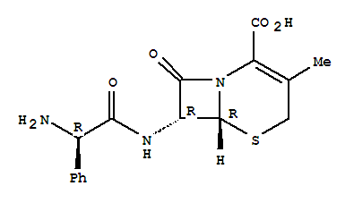 - Synonyms:5-Thia-1-azabicyclo[4.2.0]oct-2-ene-2-carboxylicacid, 7-(2-amino-2-phenylacetamido)-3-methyl-8-oxo-, D- (8CI);5-Thia-1-azabicyclo[4.2.0]oct-2-ene-2-carboxylic acid,7-[(aminophenylacetyl)amino]-3-methyl-8-oxo-, [6R-[6a,7b(R*)]]-; 5-Thia-1-azabicyclo[4.2.0]oct-2-ene-2-carboxylic acid, 7-[[(2R)-aminophenylacetyl]amino]-3-methyl-8-oxo-,(6R,7R)- (9CI); 7-(a-Amino-D-phenylacetamido)-3-deacetoxycephalosporanic acid; 7-[D-(-)-a-Aminophenylacetamido]-3-methyl-3-cephem-4-carboxylicacid; Alcephin; Alsporin; Biocef; Carnosporin; Cefablan; Cefadal; Cefadin;Cefadina; Cefadros; Cefadyl; Cefaleksin; Cefalexin; Cefalin; Cefaloto; Cefanex;Cefaseptin; Ceforal; Cefovit; Celexin; Cepastar; Cepexin; Cephacillin;Cephalexin; Cephalexine; Cephamasten; Cephaxin; Cephin; Cepol; Ceporex; CeporexForte; Ceporexin; Ceporexine; Cerexin; Cex; Check; Cophalexin; D-Cephalexin;Derantel; Durantel; Durantel DS; Ed A-Ceph; Efalexin; Erocetin; Farexin;Felexin; Fergon 500; Fexin; Garasin; Ibilex; Ibrexin; Inphalex; Iwalexin;Kefalex; Kefalospes; Kefaxin; Kefexin; Keflet; Keflex; Kefloridina; Keforal;Kekrinal; Kidolex; L-Keflex; Lafarine; Larixin; Larixin (antibiotic); Lenocef;Lexibiotico; Lilly 66873; Llonexina; Lonflex; Lopilexin; Madlexin; Mamalexin;Mamlexin; Mecilex; Medoxine; Naxifelar; Neokef; Novolexin; Nufex; Ohlexin;Oracef; Oracocin; Oriphex; Oroxin; Ospexin; Palitrex; Pectril; Phexin; Pyassan;Rinesal; Rofex; S 6437; Sanaxin; Sencephalin; Sepexin; Septilisin; Servispor;Sialexin; Sinthecillin; Sintolexyn; Sporicef; Sporidex; Syncl; Syncle; Synecl;Taicelexin; Tepaxin; Tokiolexin; Uphalexin; Voxxim; Winlex; Xahl
