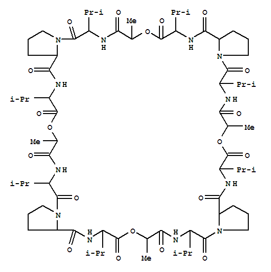 - Synonyms:Cyclic(L-lactoyl-L-valyl-D-prolyl-D-valyl-L-lactoyl-L-valyl-D-prolyl-D-valyl-L-lactoyl-L-valyl-D-prolyl-D-valyl-L-lactoyl-L-valyl-D-prolyl-D-valyl);5H,19H,33H,47H-Tetrapyrrolo[2,1-f:2',1'-r:2'',1''-d1:2''',1'''-p1][1,13,25,37,4,7,10,16,19,22,28,31,34,40,43,46]tetraoxadodecaazacyclooctatetracontine,cyclic peptide deriv.