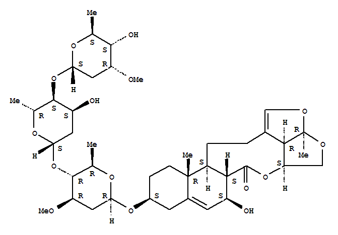 - Synonyms:6H-2,3,5-Trioxapentaleno[1',6':5,6,7]cyclonona[1,2-a]naphthalen-6-one,10-[(O-2,6-dideoxy-3-O-methyl-a-L-ribo-hexopyranosyl-(1®4)-O-2,6-dideoxy-b-D-ribo-hexopyranosyl-(1®4)-2,6-dideoxy-3-O-methyl-b-D-arabino-hexopyranosyl)oxy]-2a,4,4a,6a,7,9,10,11,12,12a,12b,13,14,14b-tetradecahydro-7-hydroxy-2a,12a-dimethyl-,[2aR-(2aR*,4aS*,6aS*,7S*,10S*,12aR*,12bS*,14bR*)]-; Cynapanoside B