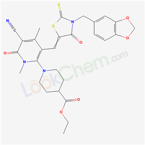 ethyl 1-(3-{[3-(1,3-benzodioxol-5-ylmethyl)-4-oxo-2-thioxo-1,3-thiazolidin-5-ylidene]methyl}-5-cyano-1,4-dimethyl-6-oxo-1,6-dihydropyridin-2-yl)piperidine-4-carboxylate(7063-40-3)