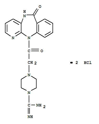 - Synonyms:6H-Pyrido[2,3-b][1,4]benzodiazepin-6-one,11-[[4-(aminoiminomethyl)-1-piperazinyl]acetyl]-5,11-dihydro-, dihydrochloride(9CI); Guanylpirenzepine