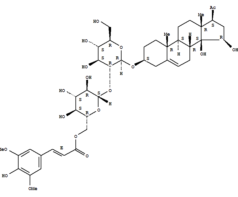 - Synonyms:Pregn-5-en-20-one,14,15-dihydroxy-3-[[2-O-[6-O-[(2E)-3-(4-hydroxy-3,5-dimethoxyphenyl)-1-oxo-2-propenyl]-b-D-glucopyranosyl]-b-D-glucopyranosyl]oxy]-, (3b,14b,15b)- (9CI); Pregn-5-en-20-one,14,15-dihydroxy-3-[[2-O-[6-O-[3-(4-hydroxy-3,5-dimethoxyphenyl)-1-oxo-2-propenyl]-b-D-glucopyranosyl]-b-D-glucopyranosyl]oxy]-, [3b(E),14b,15b]-; Hancoside; Hancoside A