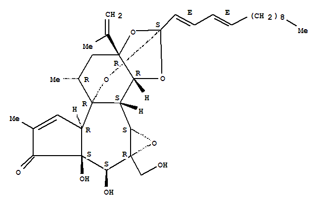 - Synonyms:6H-2,8b-Epoxyoxireno[6,7]azuleno[5,4-e]-1,3-benzodioxol-6-one,3a,3b,3c,4a,5,5a,8a,9,10,10a-decahydro-5,5a-dihydroxy-4a-(hydroxymethyl)-7,9-dimethyl-10a-(1-methylethenyl)-2-(1E,3E)-1,3-tridecadienyl-,(2S,3aR,3bS,3cS,4aR,5S,5aS,8aR,8bR,9R,10aR)- (9CI); Huratoxin;Ortho-2,4-tetradecadienoic acid, cyclic 7,8,10a-ester with5,6-epoxy-4,5,6,6a,7,8,9,10,10a,10b-decahydro-3a,4,7,8,10a-pentahydroxy-5-(hydroxymethyl)-8-isopropenyl-2,10-dimethylbenz[e]azulen-3(3aH)-one,(E,E)-(3aS,4S,5R,6S,6aS,7R,8R,10R,10aR,10bR)-(+)- (8CI);6H-2,8b-Epoxyoxireno[6,7]azuleno[5,4-e]-1,3-benzodioxol-6-one,3a,3b,3c,4a,5,5a,8a,9,10,10a-decahydro-5,5a-dihydroxy-4a-(hydroxymethyl)-7,9-dimethyl-10a-(1-methylethenyl)-2-(1,3-tridecadienyl)-,[2S-[2a(1E,3E),3ab,3bb,3cb,4ab,5b,5ab,8aa,8ba,9a,10ab]]-; Hippomane factor M1; NSC266186; [2S-[2a(1E,3E),3ab,3bb,3cb,4ab,5b,5ab,8aa,8ba,9a,10ab]]-3a,3b,3c,4a,5,5a,8a,9,10,10a-Decahydro-5,5a-dihydroxy-4a-(hydroxymethyl)-7,9-dimethyl-10a-(1-methylethenyl)-2-(1,3-tridecadienyl)-6H-2,8b-epoxyoxireno[6,7]azuleno[5,4-e]-1,3-benzodioxol-6-one