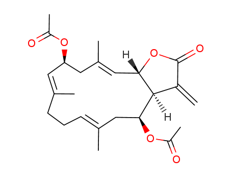 - Synonyms:Cyclotetradeca[b]furan-2(3H)-one,4,12-bis(acetyloxy)-3a,4,5,8,9,12,13,15a-octahydro-6,10,14-trimethyl-3-methylene-,[3aS-(3aR*,4R*,6E,10E,12R*,14E,15aR*)]-; Kericembrenolide C