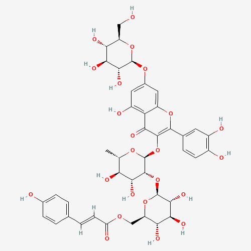 - Synonyms:quercetin 3-O-alpha-L-[6'''-p-coumaroyl-beta-D-glucopyranosyl-(1->2)-rhamnopyranoside]-7-O-beta-D-glucopyranoside;3-[(6-deoxy-2-O-{6-O-[(2E)-3-(4-hydroxyphenyl)prop-2-enoyl]-beta-D-glucopyranosyl}-alpha-L-mannopyranosyl)oxy]-2-(3,4-dihydroxyphenyl)-5-hydroxy-4-oxo-4H-chromen-7-yl beta-D-glucopyranoside;CHEBI:66286;DTXSID001098486;Q27134828;[(2R,3S,4S,5R,6S)-6-[(2S,3R,4R,5R,6S)-2-[2-(3,4-Dihydroxyphenyl)-5-hydroxy-4-oxo-7-[(2S,3R,4S,5S,6R)-3,4,5-trihydroxy-6-(hydroxymethyl)oxan-2-yl]oxychromen-3-yl]oxy-4,5-dihydroxy-6-methyloxan-3-yl]oxy-3,4,5-trihydroxyoxan-2-yl]methyl (E)-3-(4-hydroxyphenyl)prop-2-enoate;143016-73-3;2-(3,4-Dihydroxyphenyl)-3-[2-O-[6-O-[3-(4-hydroxyphenyl)acryloyl]-beta-D-glucopyranosyl]-6-deoxy-alpha-L-mannopyranosyloxy]-5-hydroxy-7-(beta-D-glucopyranosyloxy)-4H-1-benzopyran-4-one;3-[[6-Deoxy-2-O-[6-O-[(2E)-3-(4-hydroxyphenyl)-1-oxo-2-propen-1-yl]-beta-D-glucopyranosyl]-alpha-L-mannopyranosyl]oxy]-2-(3,4-dihydroxyphenyl)-7-(beta-D-glucopyranosyloxy)-5-hydroxy-4H-1-benzopyran-4-one;Quercetin 3-O-alpha-L-[6'''-p-coumaroyl-(beta-D)-glucopyranosyl-(1-2)-rhamnopyranoside]-7-O-beta-D-glucopyranoside