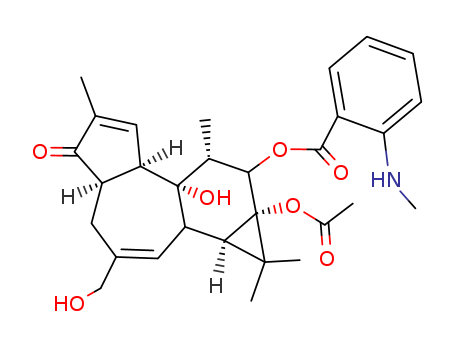 - Synonyms:Benzoicacid, 2-(methylamino)-,9a-(acetyloxy)-1a,1b,4,4a,5,7a,7b,8,9,9a-decahydro-7b-hydroxy-3-(hydroxymethyl)-1,1,6,8-tetramethyl-5-oxo-1H-cyclopropa[3,4]benz[1,2-e]azulen-9-ylester, [1aR-(1aa,1bb,4ab,7aa,7ba,8a,9b,9aa)]-;1H-Cyclopropa[3,4]benz[1,2-e]azulene, benzoic acid deriv.; Sapintoxin A