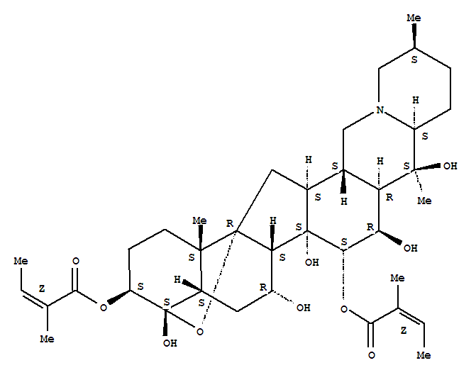 - Synonyms:Cevane-3,4,7,14,15,16,20-heptol,4,9-epoxy-, 3,15-bis(2-methyl-2-butenoate), [3b(Z),4a,7a,15a(Z),16b]-; 2H-4,16a-Epoxybenzo[7,8]fluoreno[2,1-b]quinolizine,cevane-3,4,7,14,15,16,20-heptol deriv.; 3,15-Diangeloylgermine; Germine3,15-diangelate; Stenophylline A