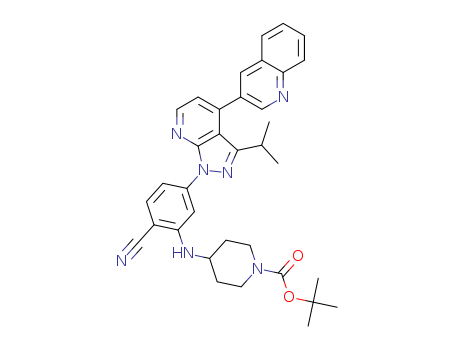 - Synonyms:tert-butyl 4-{2-cyano-5-(3-isopropyl-4-(quinolin-3-yl)-1H-pyrazolo[3,4-b]pyridin-1-yl)phenylamino}piperidine-1-carboxylate